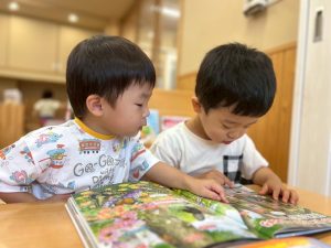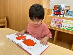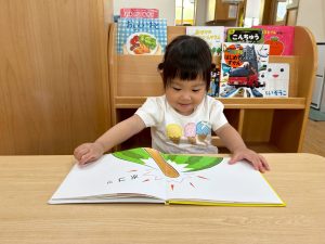 その後は、絵本や図鑑を手に取ると、「スイカとったね!🍉」「トマトあったよ🍅」と、ページの中の絵を見ながら自分の体験を思い返し、友だちと楽しそうに話し合う姿が見られました。