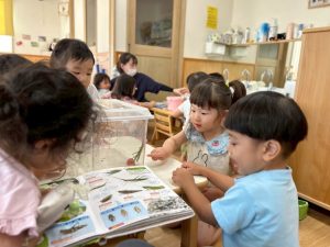 子どもたちは「何を食べるのかな?」「うんちするのかな?」と次々に疑問を口にしました。そして、その答えを探そうと図鑑を開き、載っている情報と照らし合わせながら考える姿がありました。友だちと見たことのある虫について語り合ったり、自分の経験を思い出しながら調べたりする時間は、まさに学びが遊びの中に息づいている瞬間です✨
