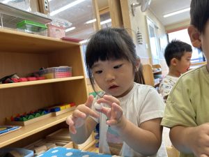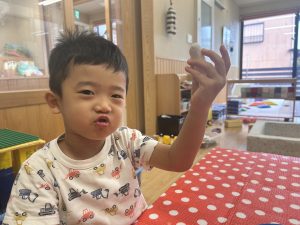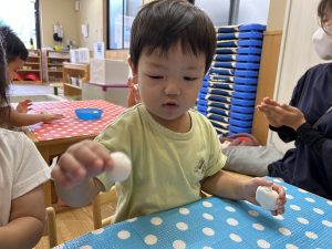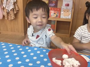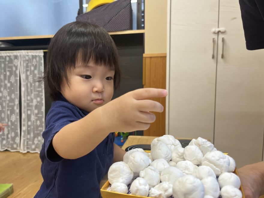 紙粘土をコロコロ丸めるのに夢中な子どもたち😊