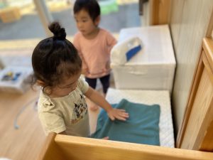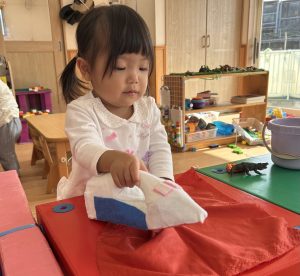 衣服を丁寧に扱う、畳むなどはお家の方や保育者をよく見ている事が伝わりますね!