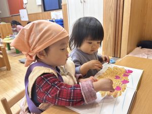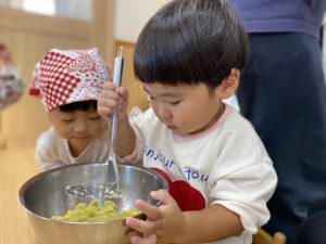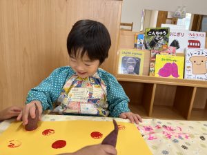 収穫したあと、お部屋に置いて「これとったねー!」と見て触ったり、 スタンプ遊びで形や色を楽しんだり、 おままごとで、さつまいもを使った料理の写真を指さして、 「つくろう!」とおもちゃのフライパンやボウルに入れて 「どうやって作るんだろう?」と、想像をふくらませながら遊ぶ姿が見られました🍳 実際の体験が、ごっこ遊びの世界とつながっている様子が伝わってきます😊 さつまいもをつぶす所からスタートです🥣