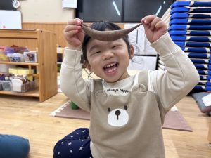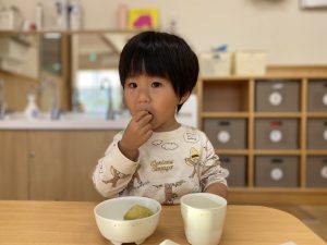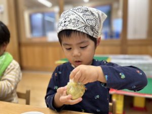 子どもたちは手首を使って“くるくる”とひねったり、形を作ってみたり…👀 おにぎりづくりのときは「ぎゅっぎゅっ」と力を込めていた子も、 今回は柔らかさの違いに気づき、力加減を調節しながら取り組んでいました✨ 茹でたてのぬくもりを手で感じたり、ふわっと広がる甘い匂いを確かめたりと、 五感を使った経験も豊かに広がりました😊