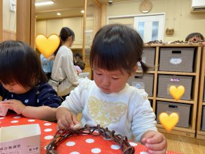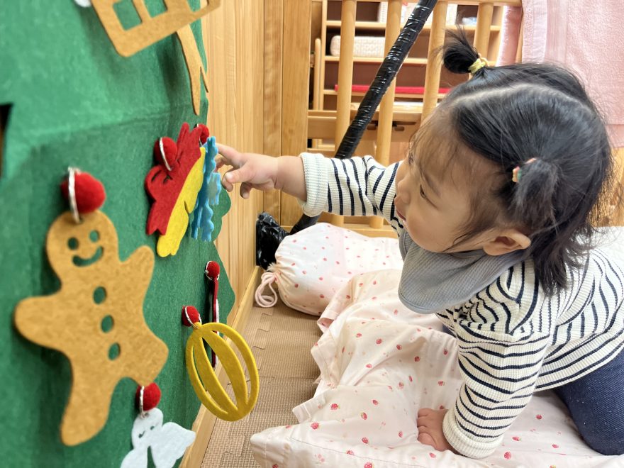 0歳児クラスのお友達はお部屋にあるツリーの玩具を楽しんでいます🎵