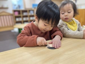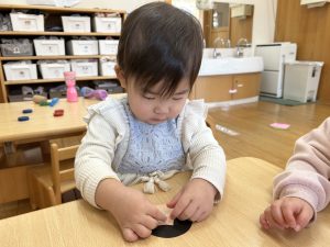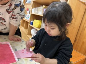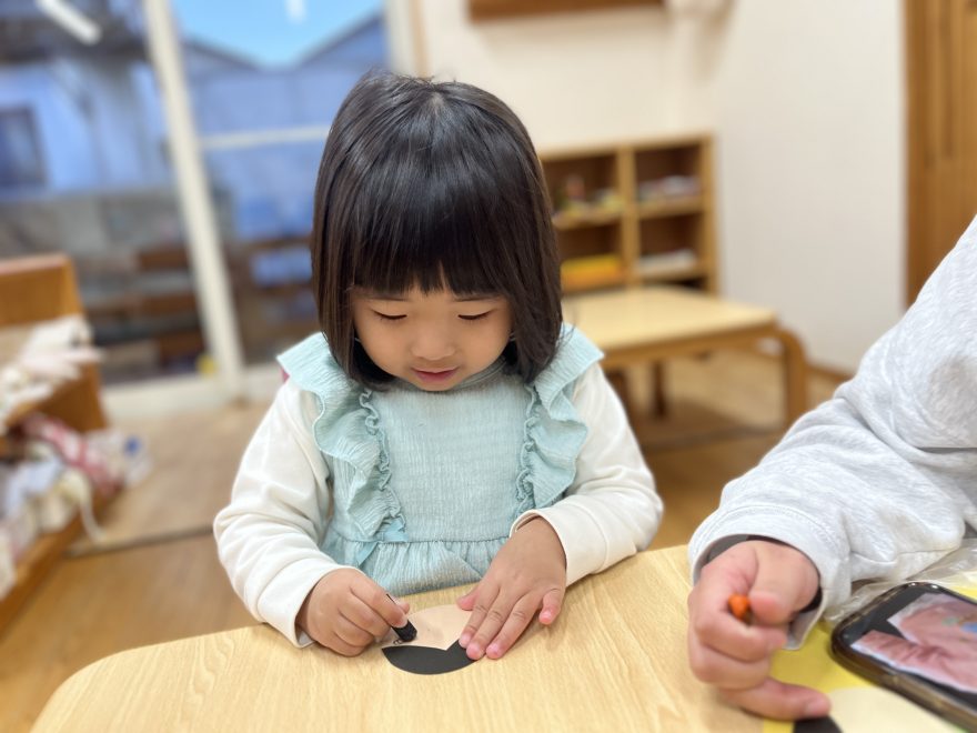 顔のパーツを一つひとつ確かめながら貼ったり、 スタンプでは力加減を工夫してきれいな形にしようとしたりとする 様子が印象的でした👀 2歳児クラスでは、折り紙で着物を作り、クレヨンで顔を描きました。 保育者の見本をよく見ながら角を合わせて折ろうとしたり、 「目はどこかな」「お鼻は1つ」と確認しながら描いたりと、 考えながら形にしていく姿が見られました🖍️