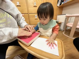 0歳児クラスでは、手形を使ってお着物の柄づくりに挑戦しました。