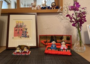 お着物にはお花型の綿棒スタンプで模様をつけました🌼